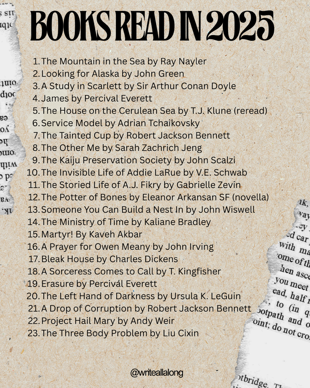 2024 was the year of long books. I read way less than twenty, if memory serves, but they were all epics. I tried to fix that in 2025 and had set the goal to read 25 books. I fell just short at 23. There was one book I got halfway through and quit on, and another that I was halfway through when the ball dropped, so let's say I read 23 and two half books. Here's the full list of my reading exploits from last year (in the order I read them):