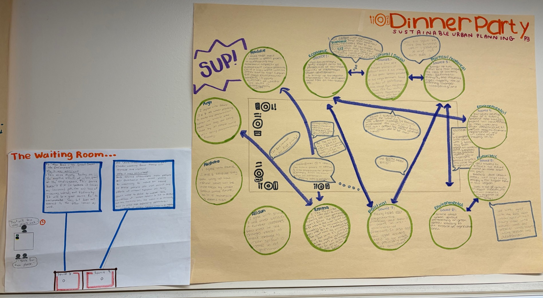 This took my students a period and a half. The second half of the second day was them returning to their notebooks, transitioning away from group collaboration and discussion to silently reflecting on the activity. They wrote about who would get invited back to a hypothetical next party (because they have more to say or their argument is just so powerful), who wouldn't get to come back (sources they are rethinking or will only use sparingly), and what voices have yet to have a say (future research). I made sure to articulate that this writing could also lead directly to them writing their paper and it's also a great thing for us to discuss at the checkpoint. Those directions are here.